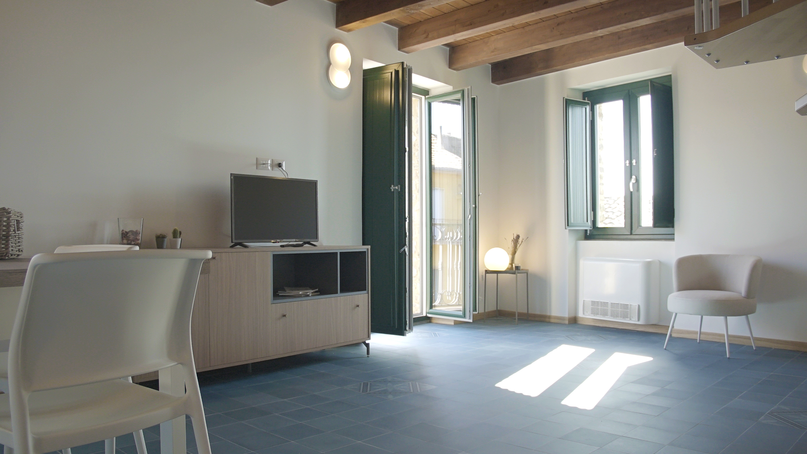 Apartment on two levels with internal staircase, consisting of a living room/kitchen on the first level and a bedroom with bathroom on the second level.